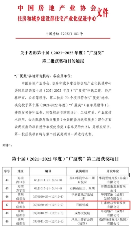 近日,由甘肅建總置業(yè)發(fā)展有限公司成都公司開發(fā)建設(shè)的百酈錦城項目榮獲中國房地產(chǎn)業(yè)最高榮譽“廣廈獎”。
