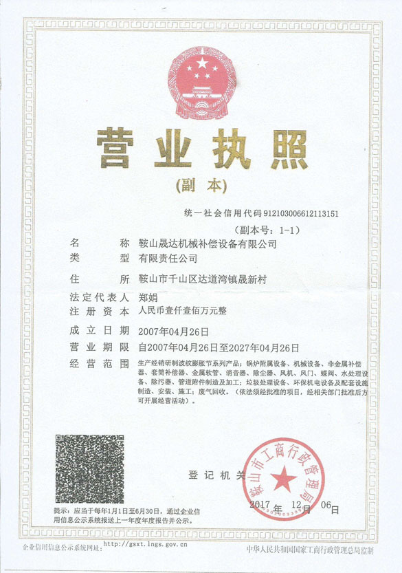 鞍山晟達(dá)機(jī)械補(bǔ)償設(shè)備有限公司成立于2007年4月,是生產(chǎn)、經(jīng)銷(xiāo)、研制波紋膨脹節(jié)系列產(chǎn)品,非金屬補(bǔ)償器,套筒補(bǔ)償器,橡膠接頭,電動(dòng)擋板閥,卸灰閥,蝶閥,消音器,刮板機(jī),除塵設(shè)備等環(huán)保類(lèi)設(shè)備的專(zhuān)業(yè)生產(chǎn)廠家。